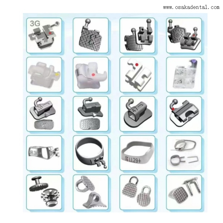 Diferentes tipos de suportes e acessórios ortodônticos dentários